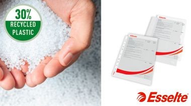 • A LEITZ és ESSELTE lefűzhető tasakok széles választéka 30%-ban fogyasztás előtti újrahasznosított alapanyag felhasználásával készül, és továbbra is 100%-ban újrahasznosítható a szokásos műanyag újrahasznosítási eljárásokban