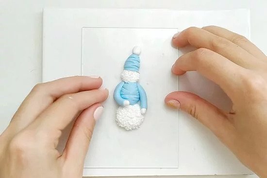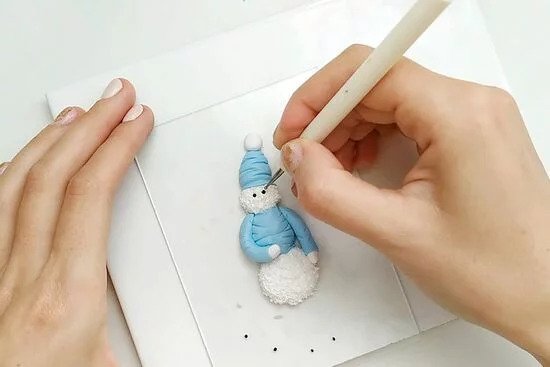 1. Készítsünk három különböző méretű golyót a FIMO fehér gyurmájából. Formáljunk egy hóembert belőle, majd tű segítségével alakítsuk a gyurmát úgy, hogy olyannak tűnjön, mintha hóbol készítettük volna.