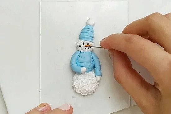 6. Tű segítségével készítsük el a pulóver mintázatát a karoknál is. A FIMO fekete gyurmából pedig készítsük el a hóember szemét és száját.