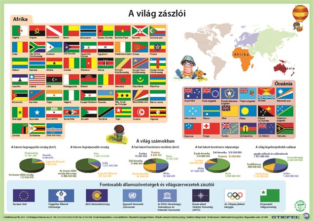 A világ zászlói két oldalas alátétünk segítségével gyermeke szórakozva tanulhat, információkat szerezhet a világ országairól, aktuális geopolitikai felosztásáról. A világ összes, az ENSZ által ma elismert országának zászlója földrészenként csoportosítva látható a terméken, amelyek hitelességét hazánk egyetlen Zászlómúzeumának szakértője, Balogh László vizsgálta meg. A könyöklőn a zászlókon túl egy rendhagyó ábrázolás, hazánk nemzeti lobogójának történelmi fejlődése is látható, továbbá egy érdekes, könnyen érthető statisztikai adathalmaz a világ országainak nagyságáról, népességéről, vallási megoszlásáról… Ez a könyöklő kitűnő ajándék nemcsak az olthatatlan tudásszomjú nebulók, hanem a földrajz vagy a világpolitikai kérdések iránt érdeklődő felnőttek számára is.