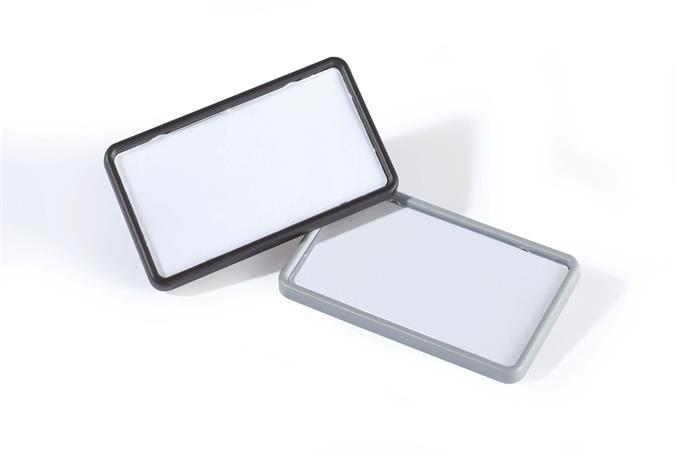 Elegáns névkitűző, színes kerettel és karcálló fedlappal.